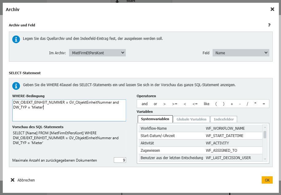 Hier ist ja leider kein SQL Zugriff möglich. Dennoch können wir eine "versteckte" DW-Funktion ausnutzen: Wenn wir im Daten zuweisen ein Archiv abfragen, sind die Abfrageergebnisse immer absteigend nach DocID sortiert (zumindest bis einschl. Version 7.7, wer weiß was zukünftige Updates bringen).