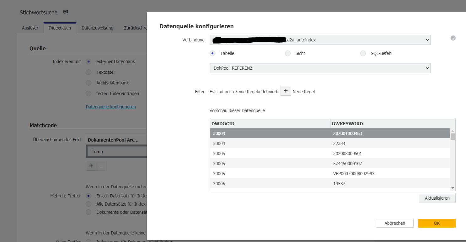 Nun baue ich gerade einen zweiten Workflow, mit dem ich schauen will, ob für die bekannte Garantienummer mittlerweile eine Gutschrift eingegangen ist. Hier wäre bei einem Dokument in dem Stichwortfeld "Referenz" die Gutschriftsnummer vorhanden. Normale Indexfelder kann ich auslesen, das Stichwortfeld wird mir nicht angeboten.