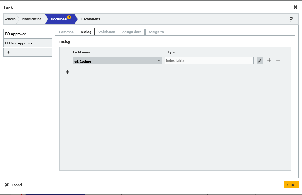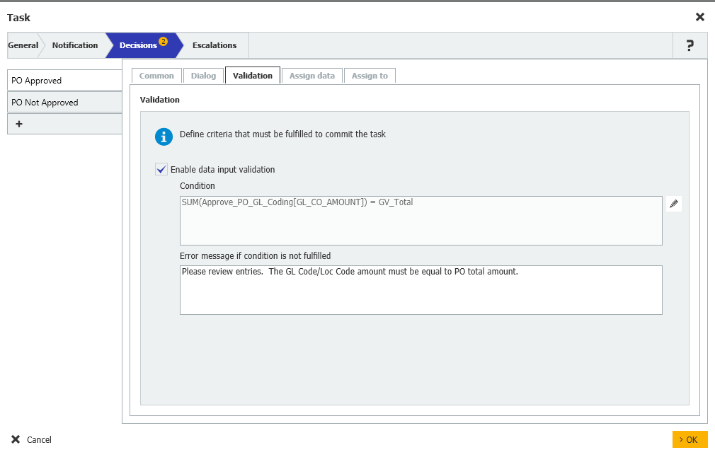I created a workflow task to assign GL codes to a purchase order. I have a Field "GL Code" as type Table.  In the decisions tab, I added a dialog called "GL Coding" which is an index table.  I added a validation condition of "SUM(Approve_PO_GL_Coding[GL_CO_AMOUNT]) = GV_Total" where the SUM amount is coming from the workflow fields and "GV_Total" is a variable that holds the total amount.