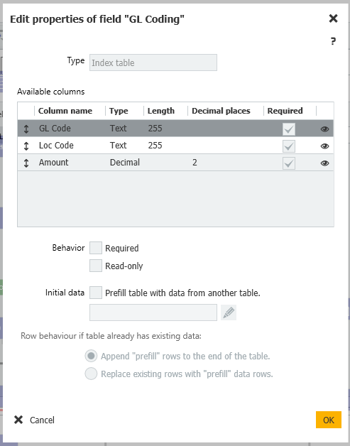 In the Assign Data tab - this is where we should be storing what was entered but I'm confused.  I select the destination type of "Index table - Multiple columns", Field/Variable of "GL Coding" and I'm confused on Entry type and the entry.