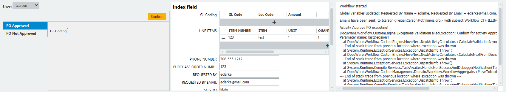 Yes, thank you.  I thought I had to do that because of an article I had found suggested that.  I'm testing the workflow but I'm not getting prompted to enter the GL Coding information - I have "GL Coding*" in the confirm box (see screen shots) - I know I have something wrong but trying to figure it out.  When I add a text field in the dialog - that pops up.  Any thoughts on this?