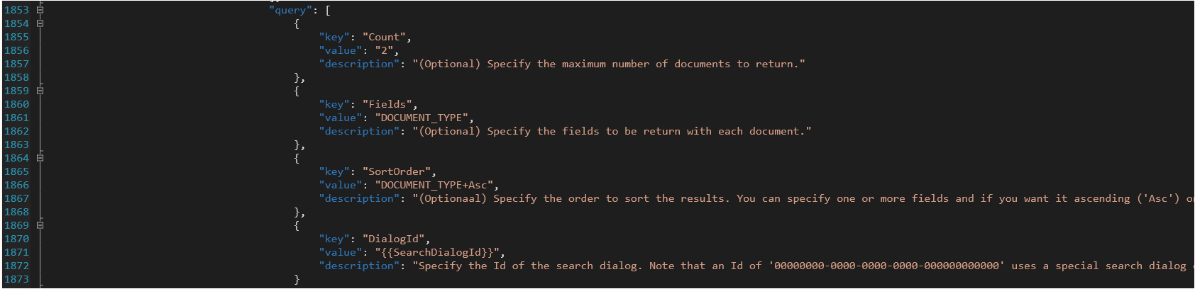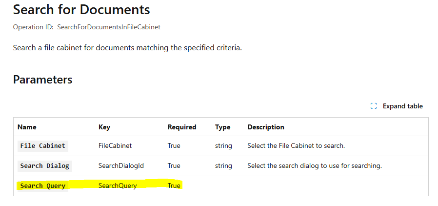 I am having issues with the Search for Documents API. One of the parameters is "Search Query". I don't know what should be put here to make the call work. There is no guidance on the correct format for this parameter. Is this a index field name? A FileCabinet?