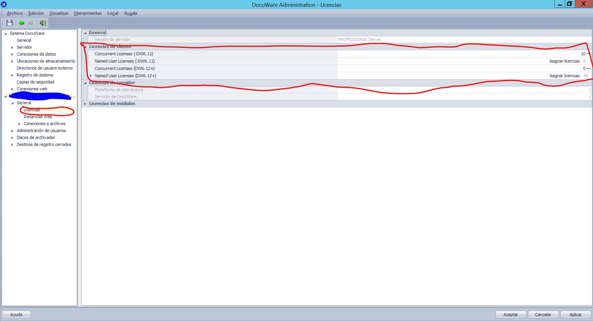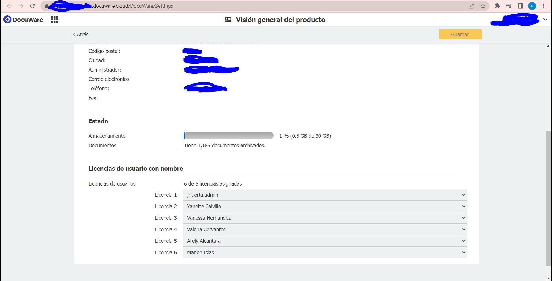 In docuware cloud, logging in the browser with the docuware administrator user,<br> configuration / product overview&nbsp;&nbsp;for both occupied space and licenses<br> <br> In docuware on premise in the administration to see the licenses you must go to part of (name of the organization) / general / licenses<br> <br> Finally, if you want to know how much space the documents occupy, you must go to administration / storage locations and from there see the url of the paths, you must go to those locations and through the windows properties see how much space they occupy.<br> <br> in file cabinets is where the documents are stored.<br> <br> &nbsp;