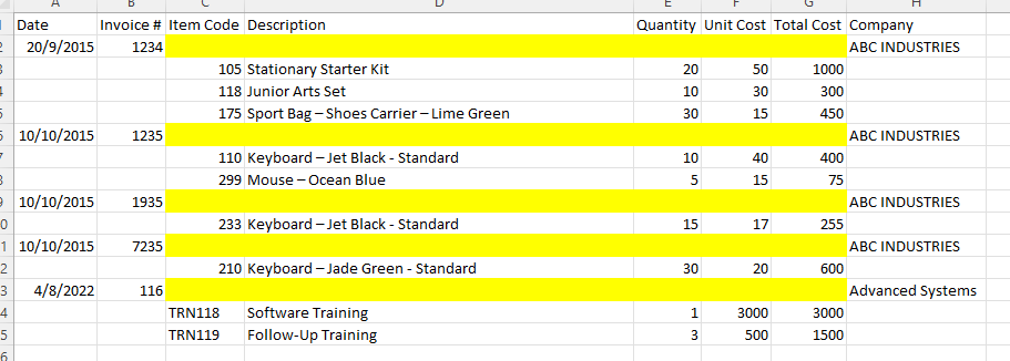 Objective is to have each line item, which is from the table, displayed in each row. Common indexes like Date, Invoice# and Company should appear once only for each document.
