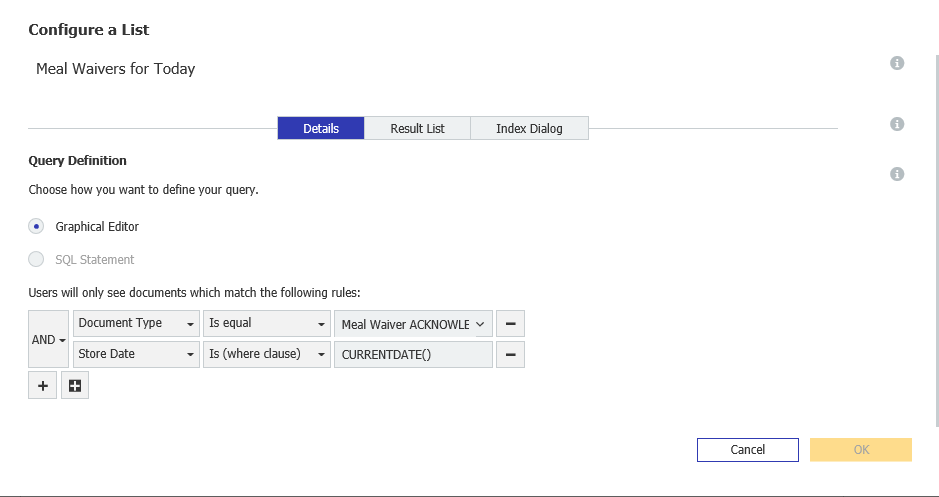 Does anyone know how to create a dialog list of documents stored today. It's a simple list that I am looking for that just gets a document type called "Meal Waiver" for that day.  The client now has a form that I built for employees to fill out.  They just want to have a quick list for the forms that are filled out that day without having to build the search each time they want it.