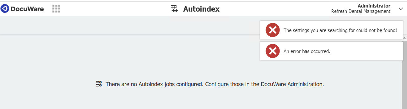 Trying to display the results of any AutoIndex job produces an error "The settings you are searching for could not be found", and "An error has occurred". The main page reports that there are no AI jobs configured and instructs me to configure them in the DocuWare Administration. Again, this is version 7.3.