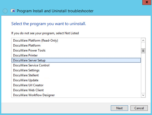 Check the windows installer cache for any DocuWare MSIs. It is a hidden folder, even with 'show hidden folders' enabled, so go there manually - C:\Windows\Installer. You'll want to add the author and comment columns to find useful files. It could be something is still stuck ... so right click on the MSIs and choose uninstall. Not sure if that is the issue, but worth checking.