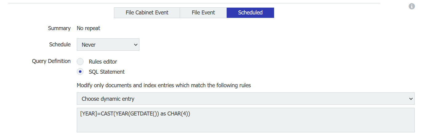 I need to create records in one file cabinet for a set of record from another cabinet, this must be done automatically once a year. The new records include a text field called year, I set a filter in the Trigger tab of Autoindex as in the screenshot, it's works perfectly. Now I want to make the year value dynamic based on the current date at the time of execution, is it possible to do that?